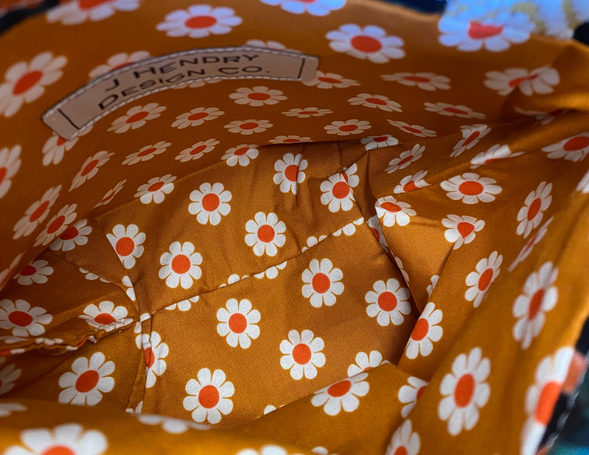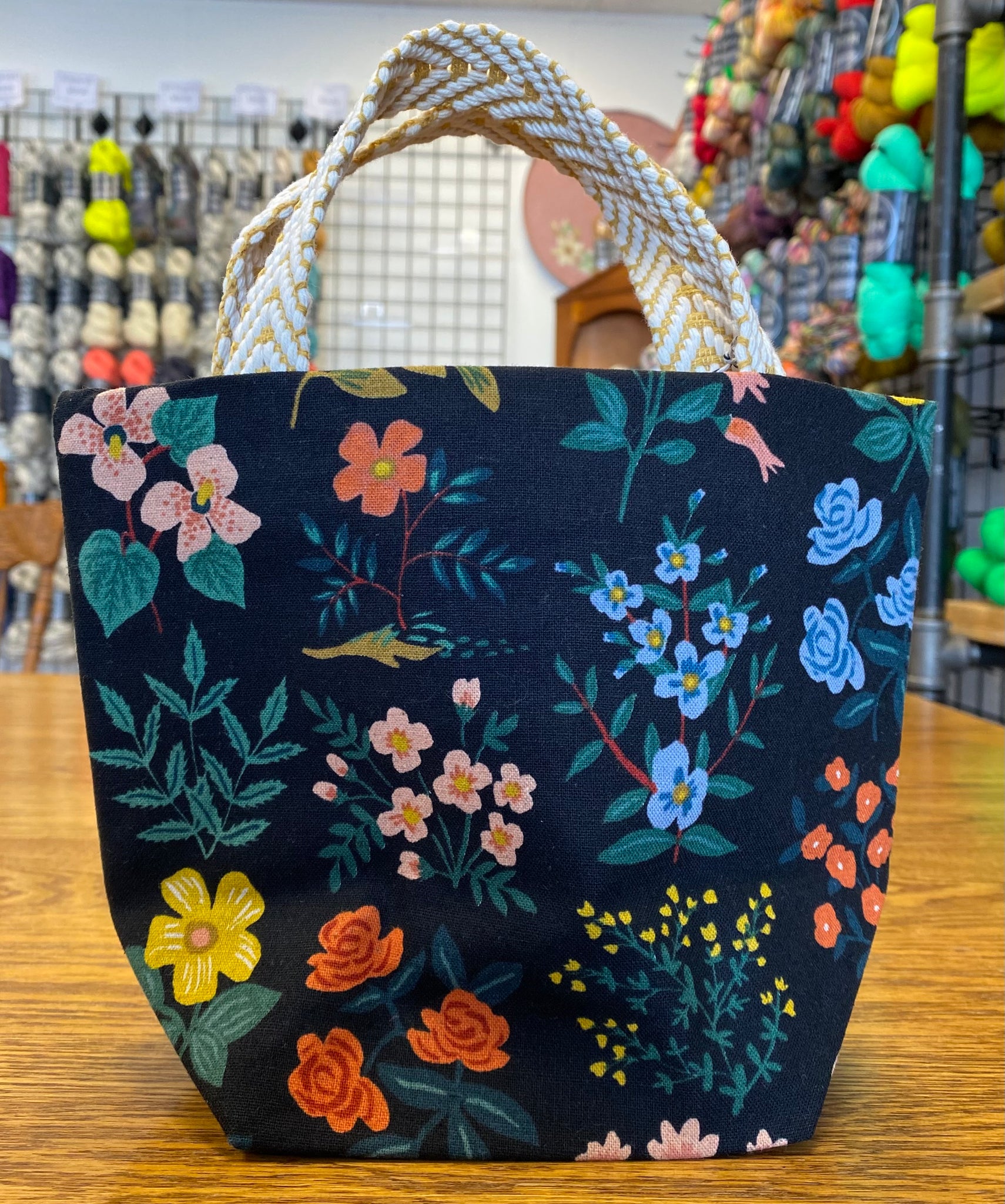 Modelled after the older version of our yarn bowl, this one is wider, taller and has straps! These bags are perfect for working on your project on the couch or on the table at craft night! With a wide gusset to prevent tipping it’s perfect for holding a cake of yarn and the top can be folded down to keep the straps from interfering with your working yarn.