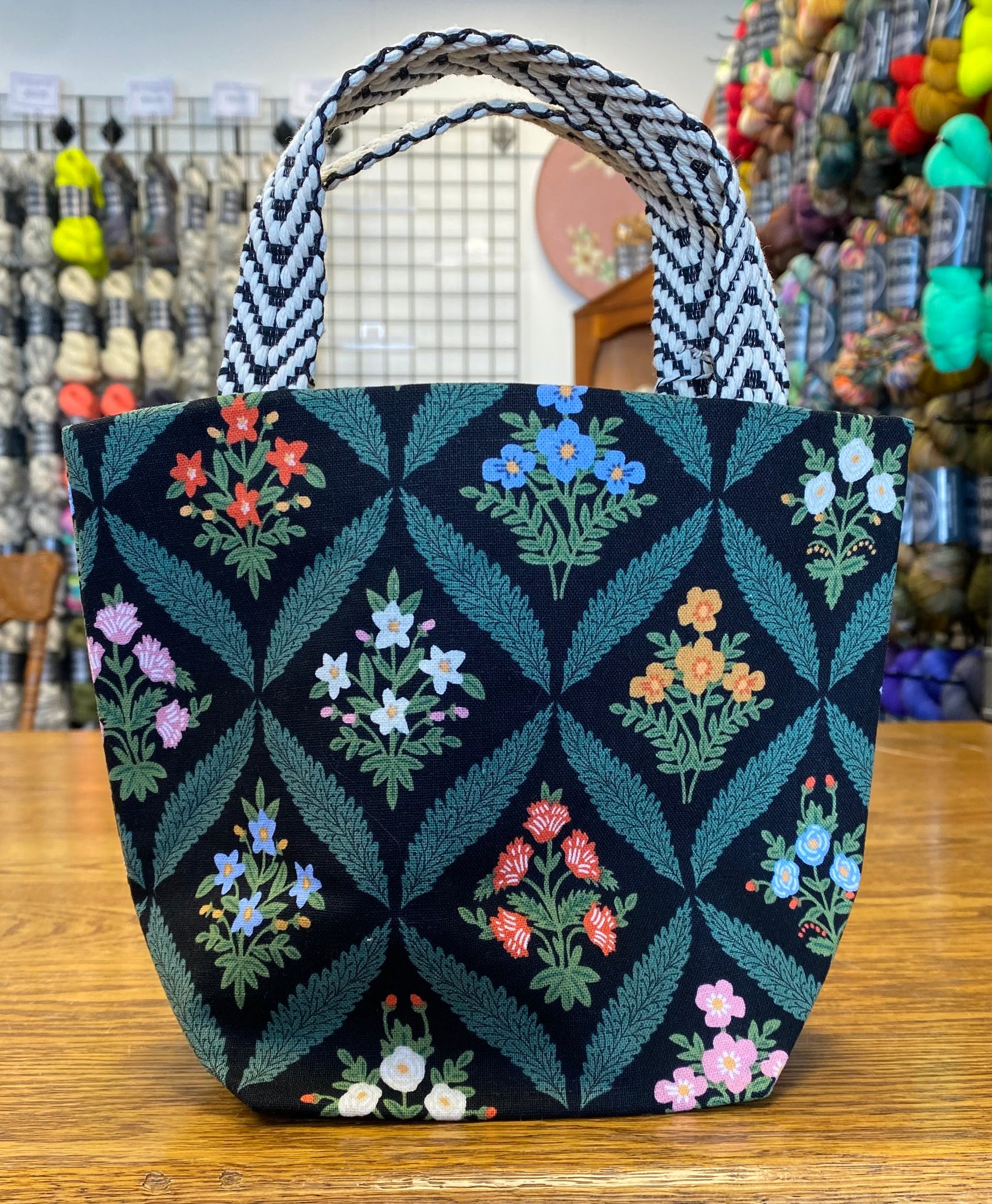 Modelled after the older version of our yarn bowl, this one is wider, taller and has straps! These bags are perfect for working on your project on the couch or on the table at craft night! With a wide gusset to prevent tipping it’s perfect for holding a cake of yarn and the top can be folded down to keep the straps from interfering with your working yarn.