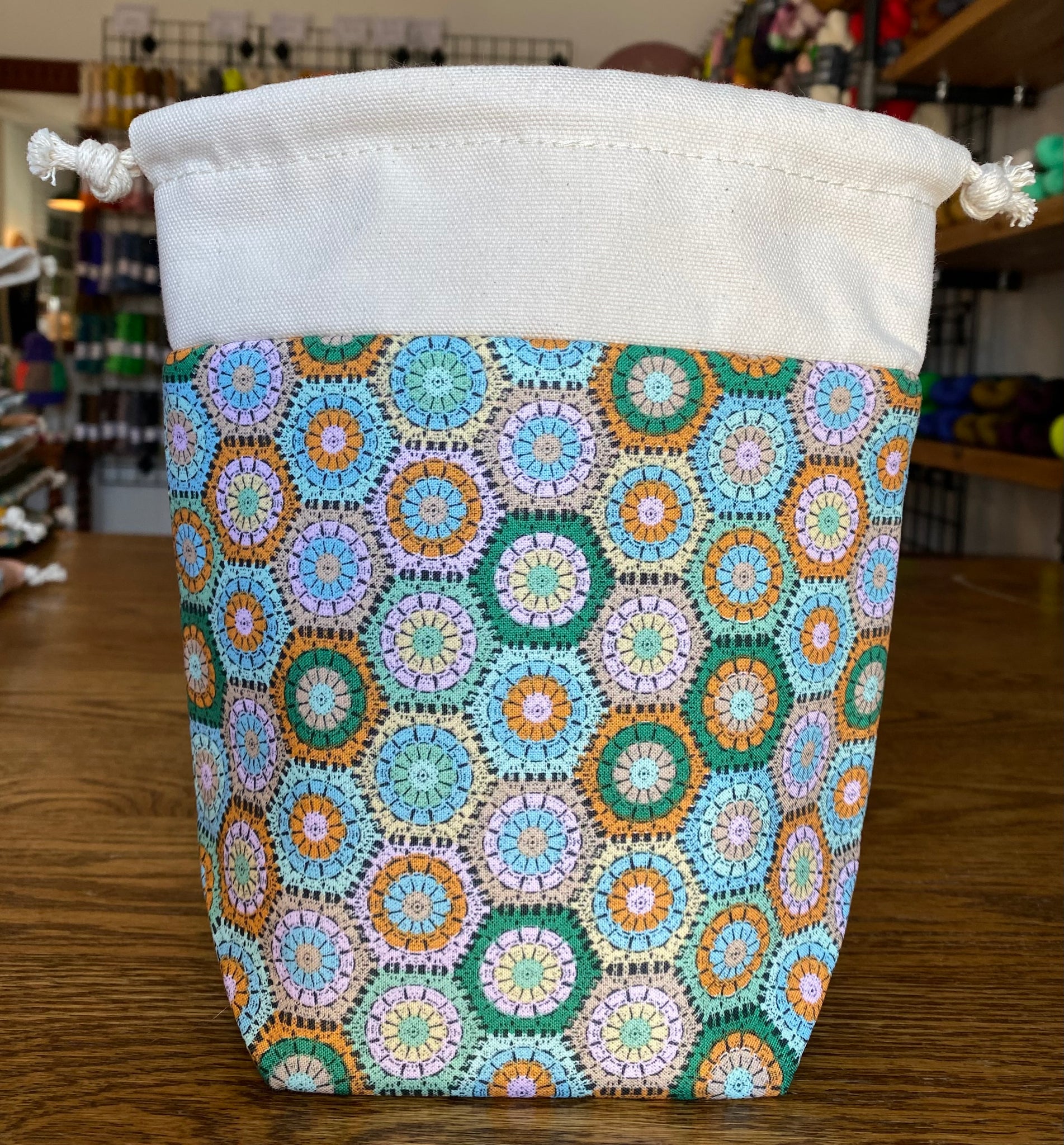 Modelled after our previous bag style the mini drawstring yarn bowl, this one can still go all the places with you! These bags are perfect for a single skein project that you want to take with you everywhere, just in case you get a moment to work on it. This bag is made with a medium flex interfacing allowing for it to be compact when packed away but will stand up on its own. The wide gusset on the bottom gives it stability to be worked out of as if it is a yarn bowl without tipping.