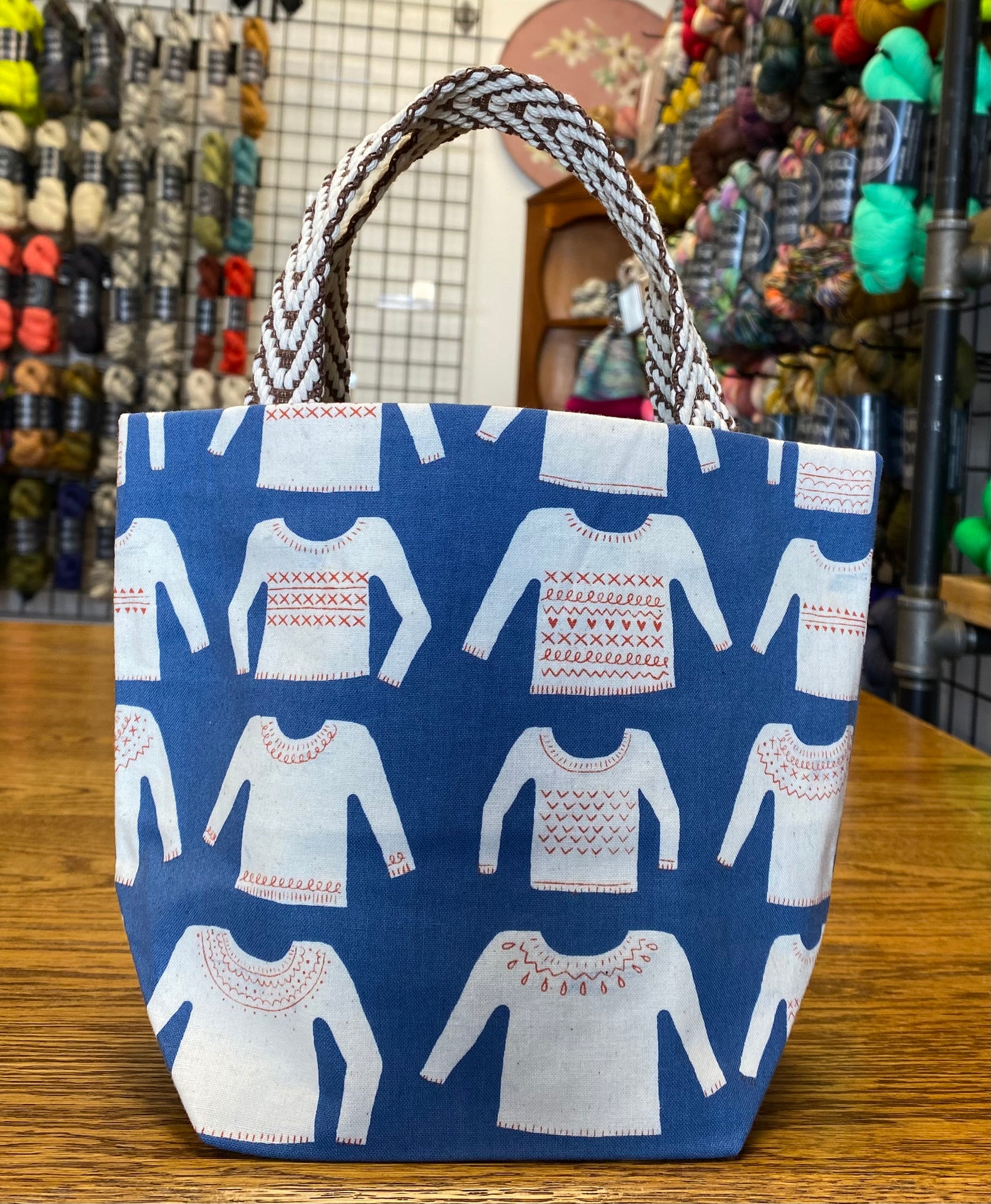 Modelled after the older version of our yarn bowl, this one is wider, taller and has straps! These bags are perfect for working on your project on the couch or on the table at craft night! With a wide gusset to prevent tipping it’s perfect for holding a cake of yarn and the top can be folded down to keep the straps from interfering with your working yarn.