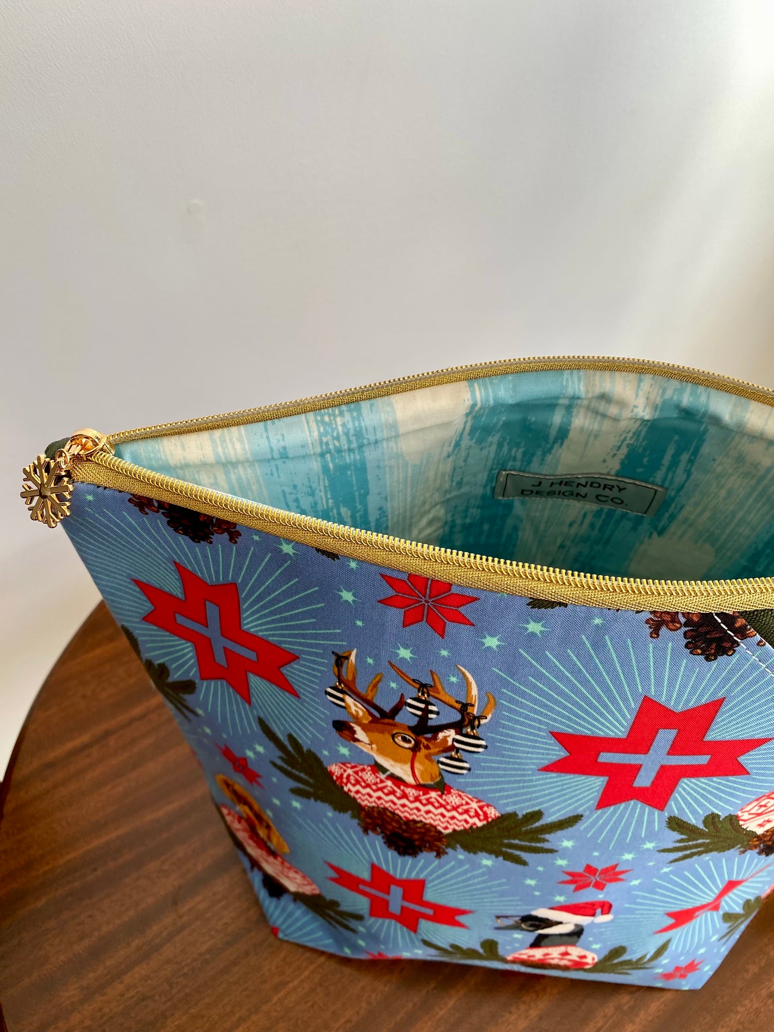 The exterior is made from a sturdy canvas and the interior is made from an interfaced quilting cotton. The zipper on these bags are larger and easier to grab and feature some great pulls that match the theme of the bag!