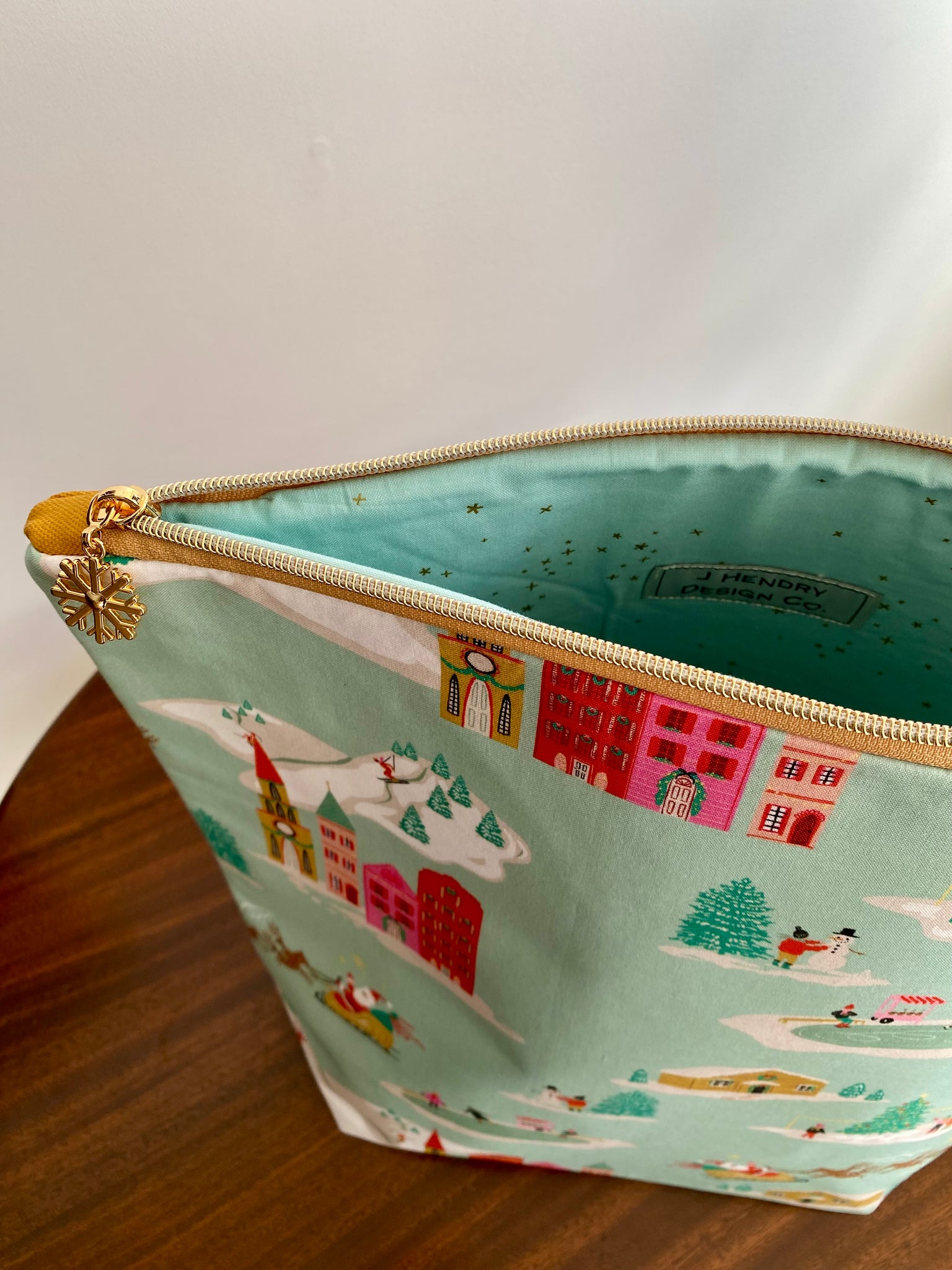 The exterior is made from a sturdy canvas and the interior is made from an interfaced quilting cotton. The zipper on these bags are larger and easier to grab and feature some great pulls that match the theme of the bag!