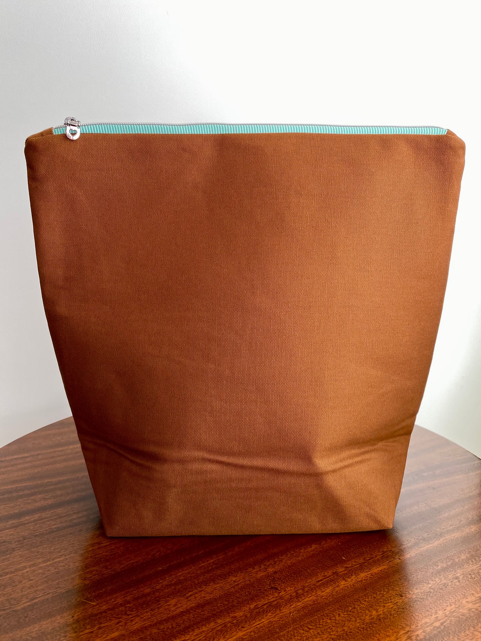 A sweater size bag that features a handy pocket on the outside for all the things that you don't want to tangle with your yarn while you're knitting!