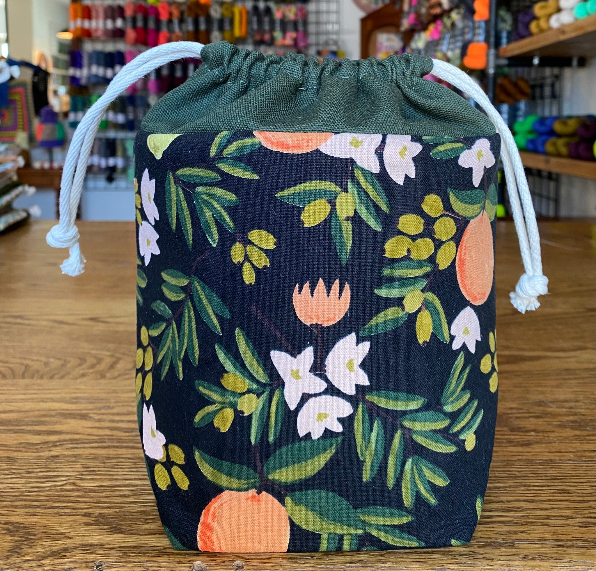 Modelled after our previous bag style the mini drawstring yarn bowl, this one can still go all the places with you! These bags are perfect for a single skein project that you want to take with you everywhere, just in case you get a moment to work on it. This bag is made with a medium flex interfacing allowing for it to be compact when packed away but will stand up on its own. The wide gusset on the bottom gives it stability to be worked out of as if it is a yarn bowl without tipping.