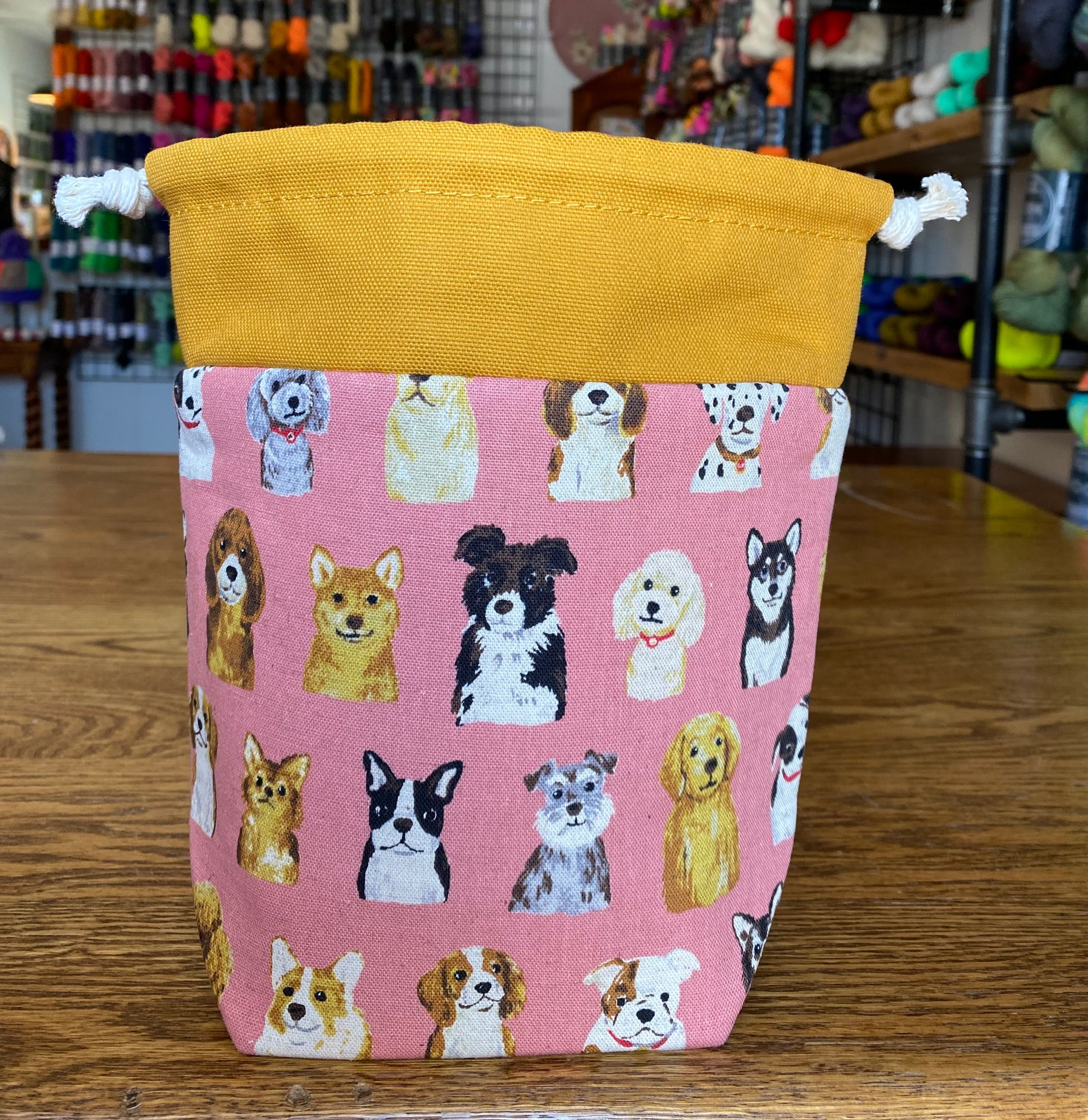 Modelled after our previous bag style the mini drawstring yarn bowl, this one can still go all the places with you! These bags are perfect for a single skein project that you want to take with you everywhere, just in case you get a moment to work on it. This bag is made with a medium flex interfacing allowing for it to be compact when packed away but will stand up on its own. The wide gusset on the bottom gives it stability to be worked out of as if it is a yarn bowl without tipping.