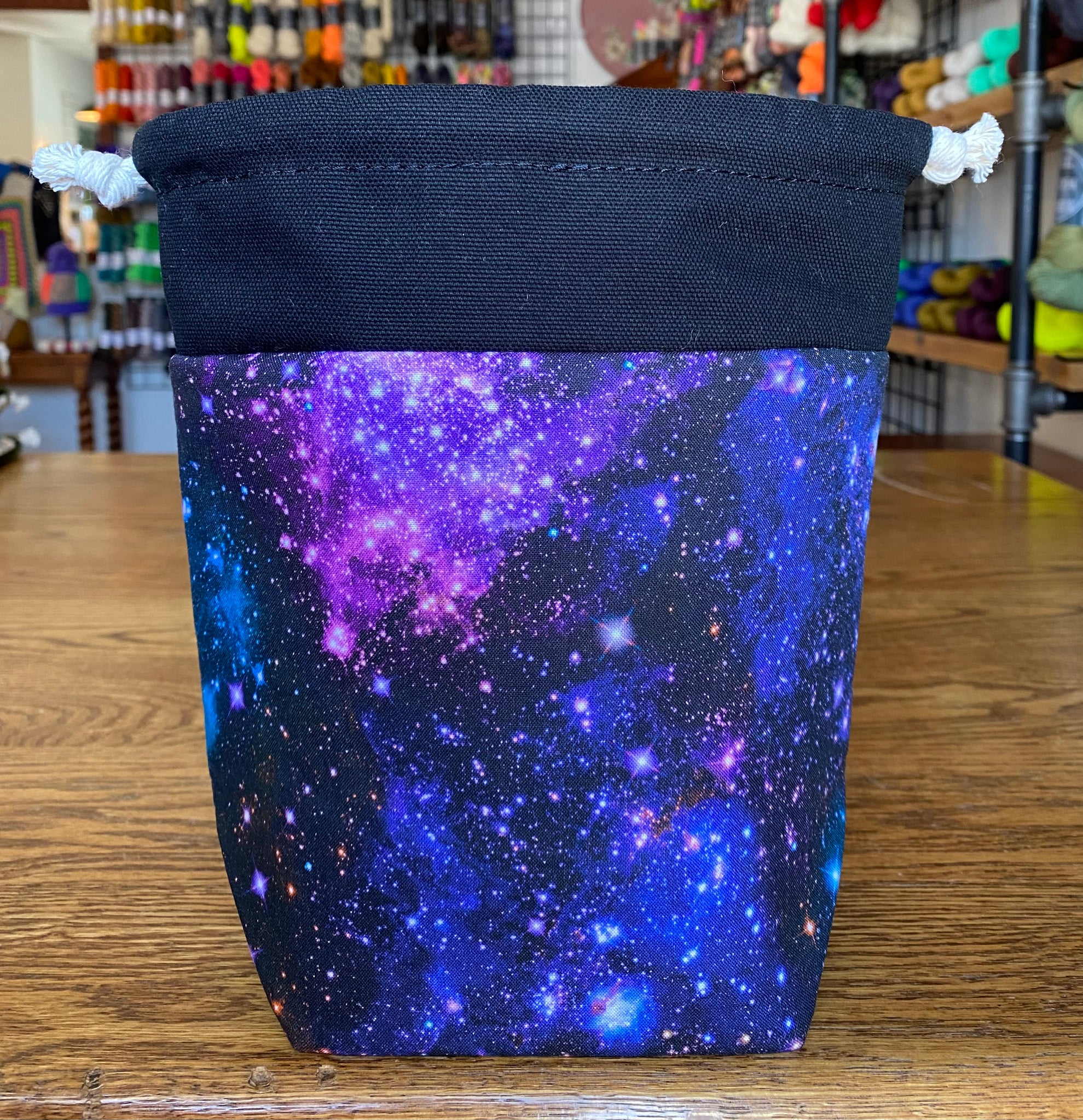Modelled after our previous bag style the mini drawstring yarn bowl, this one can still go all the places with you! These bags are perfect for a single skein project that you want to take with you everywhere, just in case you get a moment to work on it. This bag is made with a medium flex interfacing allowing for it to be compact when packed away but will stand up on its own. The wide gusset on the bottom gives it stability to be worked out of as if it is a yarn bowl without tipping.